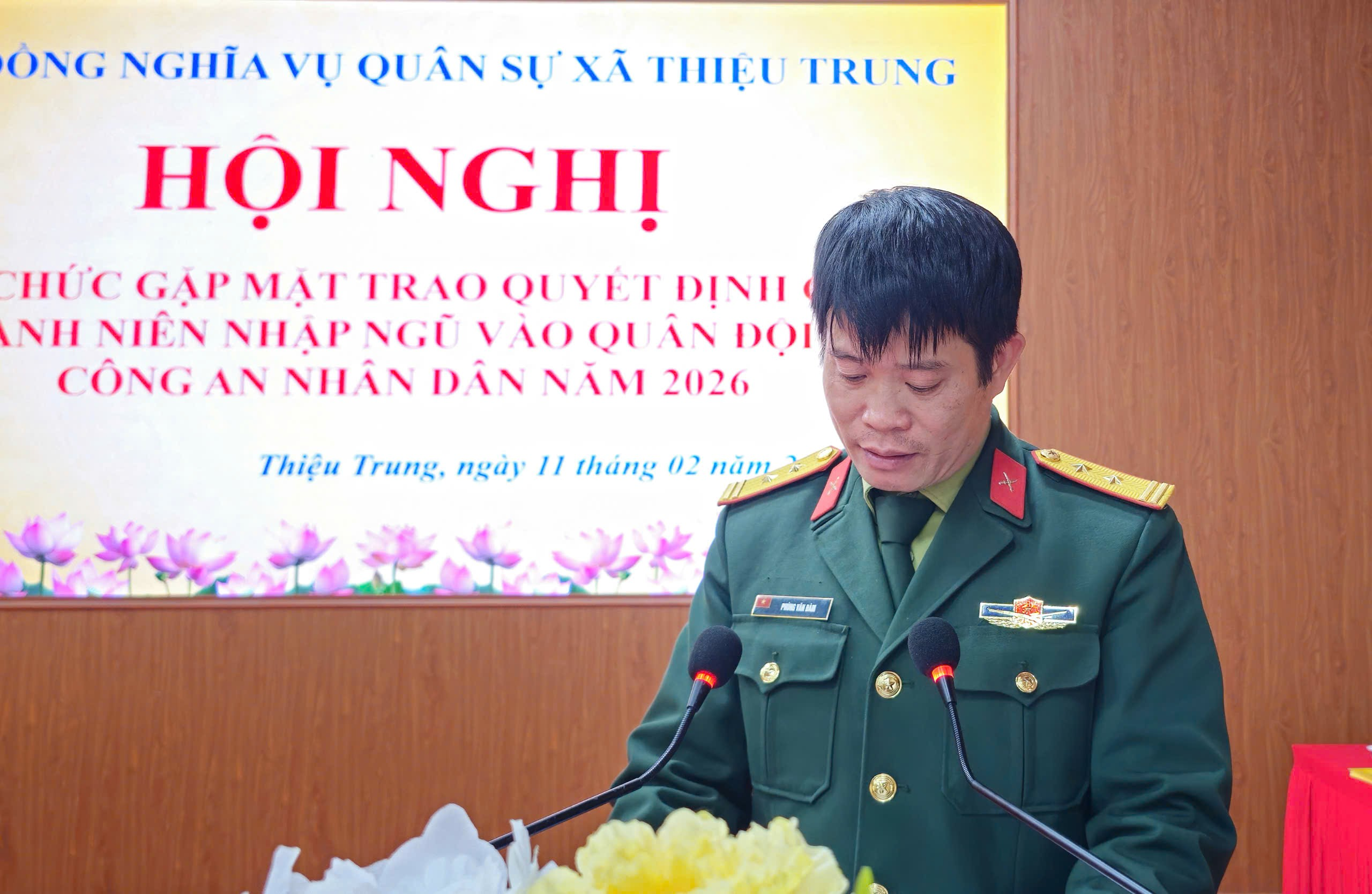 Tham dự hội nghị có đồng chí Đỗ Thế Bằng, Bí thư Đảng uỷ, Chủ tịch UBND xã; Đồng chí Trịnh Đình Tùng, Chủ tịch UBND, Chủ tịch Hội đồng NVQS xã; các đồng chí lãnh đạo HĐND, UBND, Ủy ban MTTQ xã, cùng các thành viên Hội đồng Nghĩa vụ quân sự xã. Và toàn thể các thanh niên trúng tuyển nghĩa vụ quân sự, nghĩa vụ tham gia Công an nhân dân năm 2026.