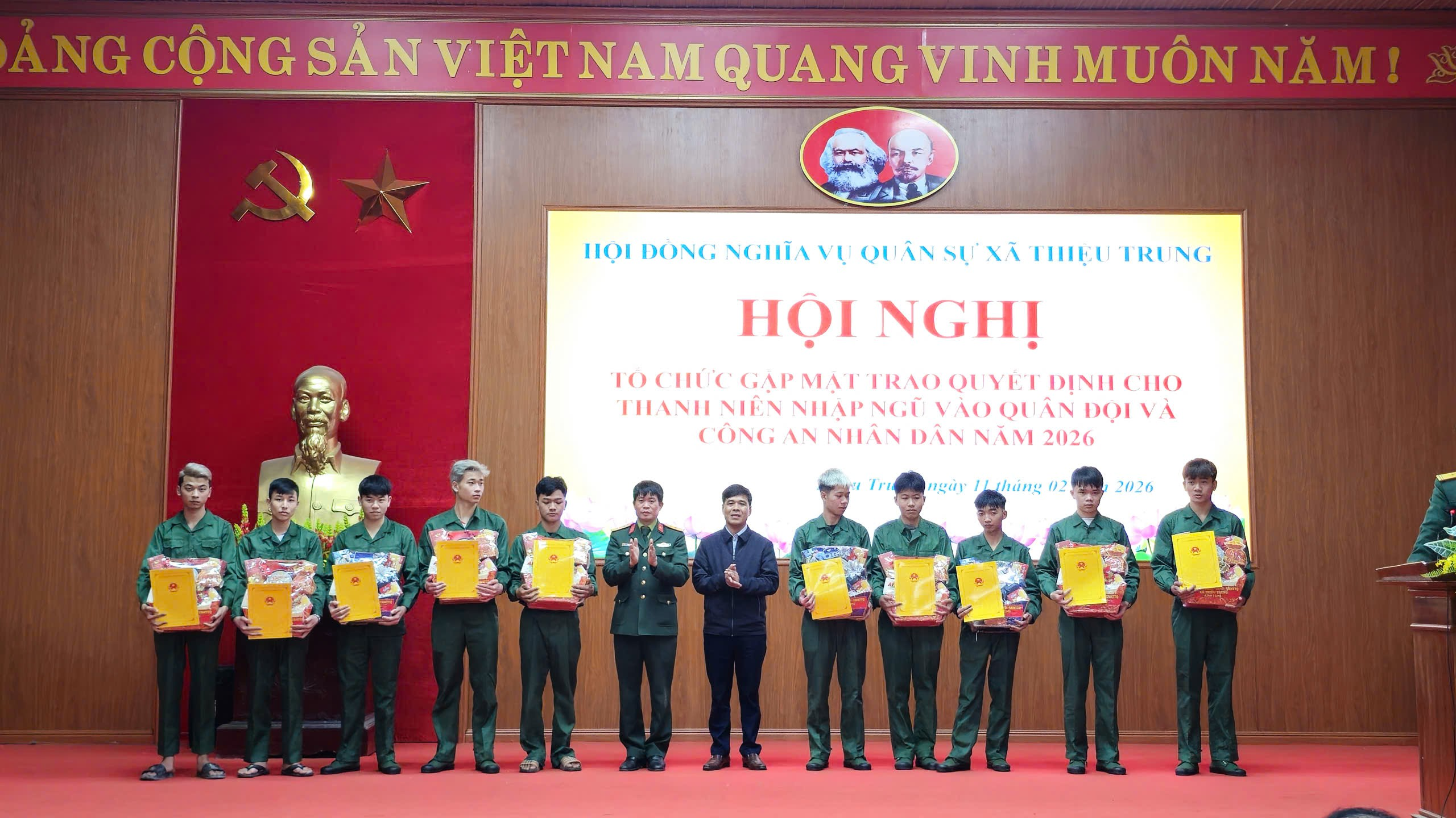 Trong sắc phục quân đội chỉnh tề, các thanh niên ưu tú của xã Thiệu Trung đã có mặt từ sớm để nhận Quyết định gọi nhập ngũ. Tại buổi lễ, lãnh đạo địa phương cùng đại diện Ban Chỉ huy quân sự và Công an xã đã trực tiếp trao lệnh gọi và tặng những phần quà Tết ý nghĩa cho các tân binh. Đây là sự động viên kịp thời, tiếp thêm động lực để các bạn trẻ yên tâm, phấn khởi trước ngày lên đường thực hiện nhiệm vụ.