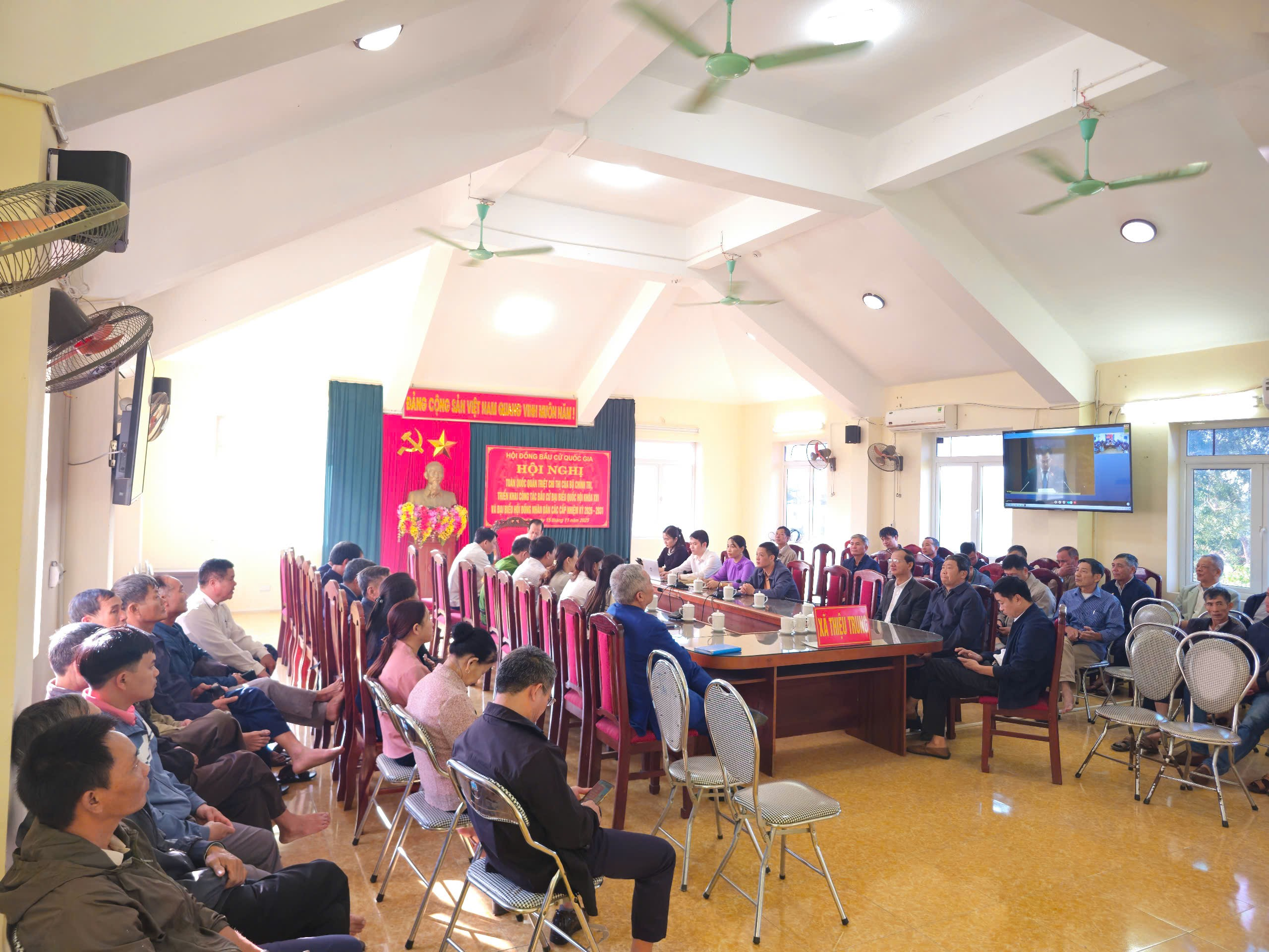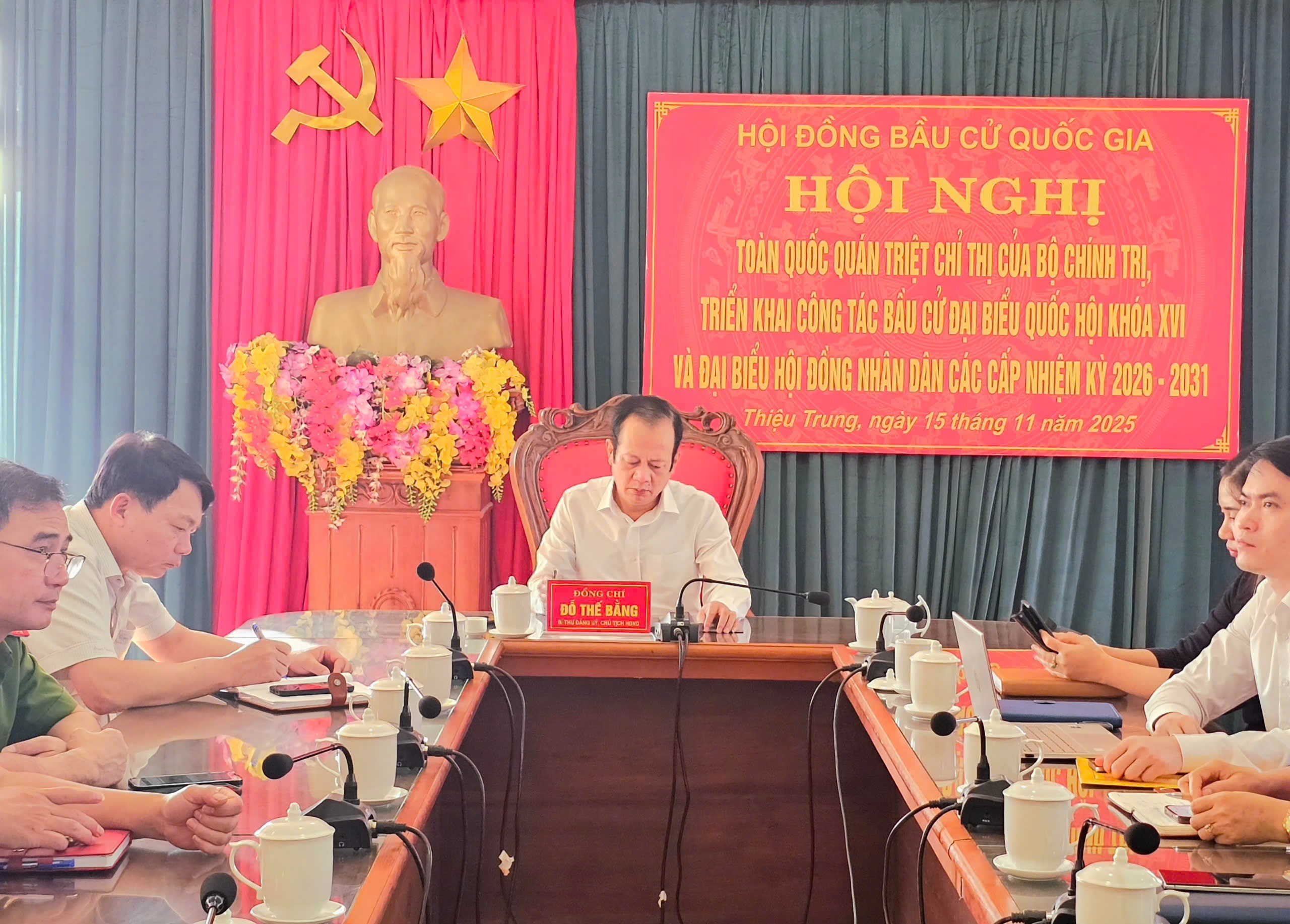 Tham dự hội nghị tại điểm cầu Đảng uỷ xã Thiệu Trung, có đồng chí Đỗ Thế Bằng, Bí thư Đảng uỷ, Chủ tịch HĐND xã; Các đồng chí thành viên Ban chỉ đạo bầu cử xã; Uỷ ban bầu cử cấp xã theo QĐ 1231/QĐ-UBND ngày 14 tháng 11 năm 2025; Các đồng chí Thường trực HĐND; Ban Thường trực Uỷ Ban MTTQ xã; Các đồng chí Bí thư chi bộ; Trưởng ban công tác mặt trận; Các đoàn thể; Trưởng thôn, khu phố.