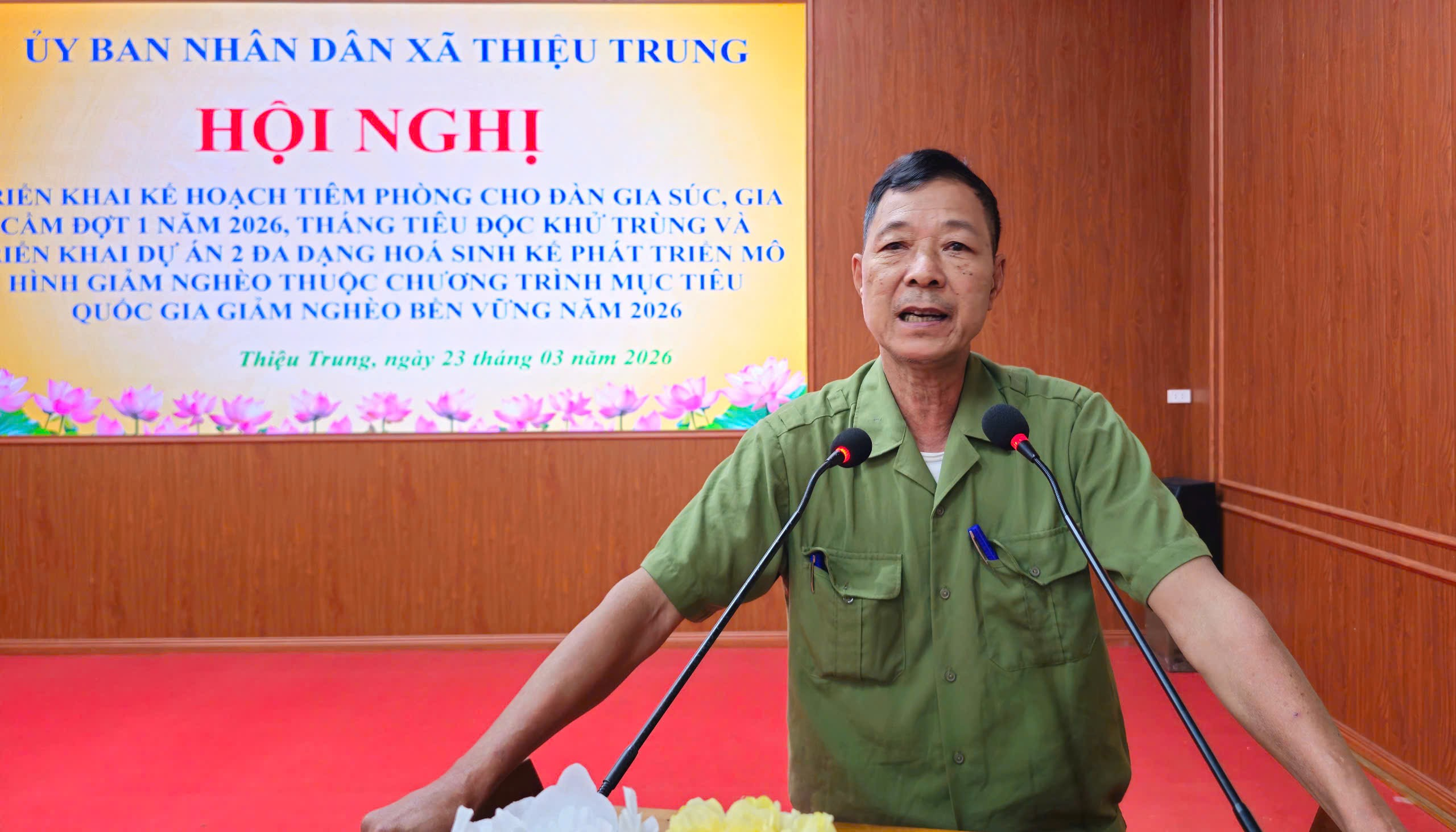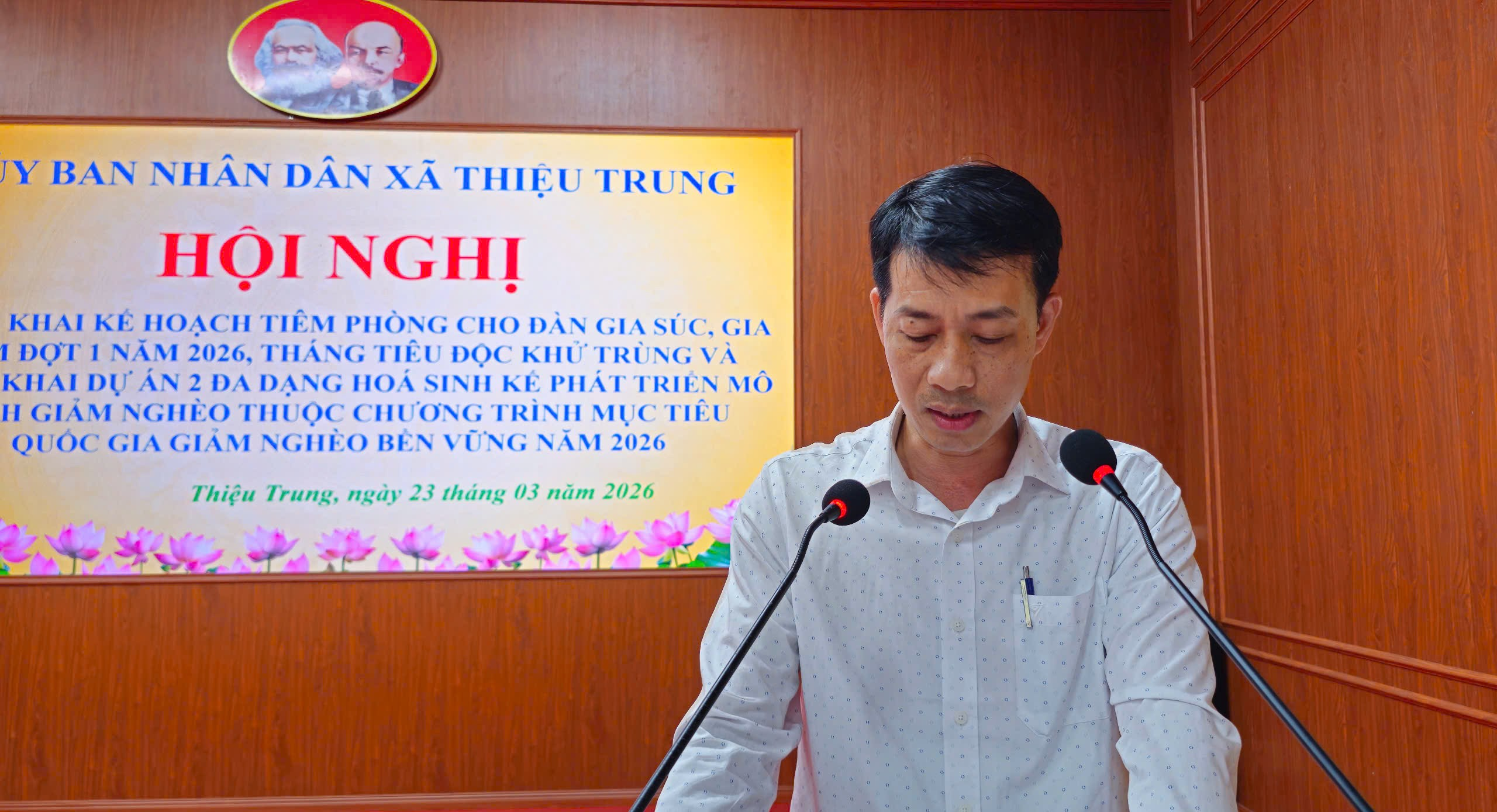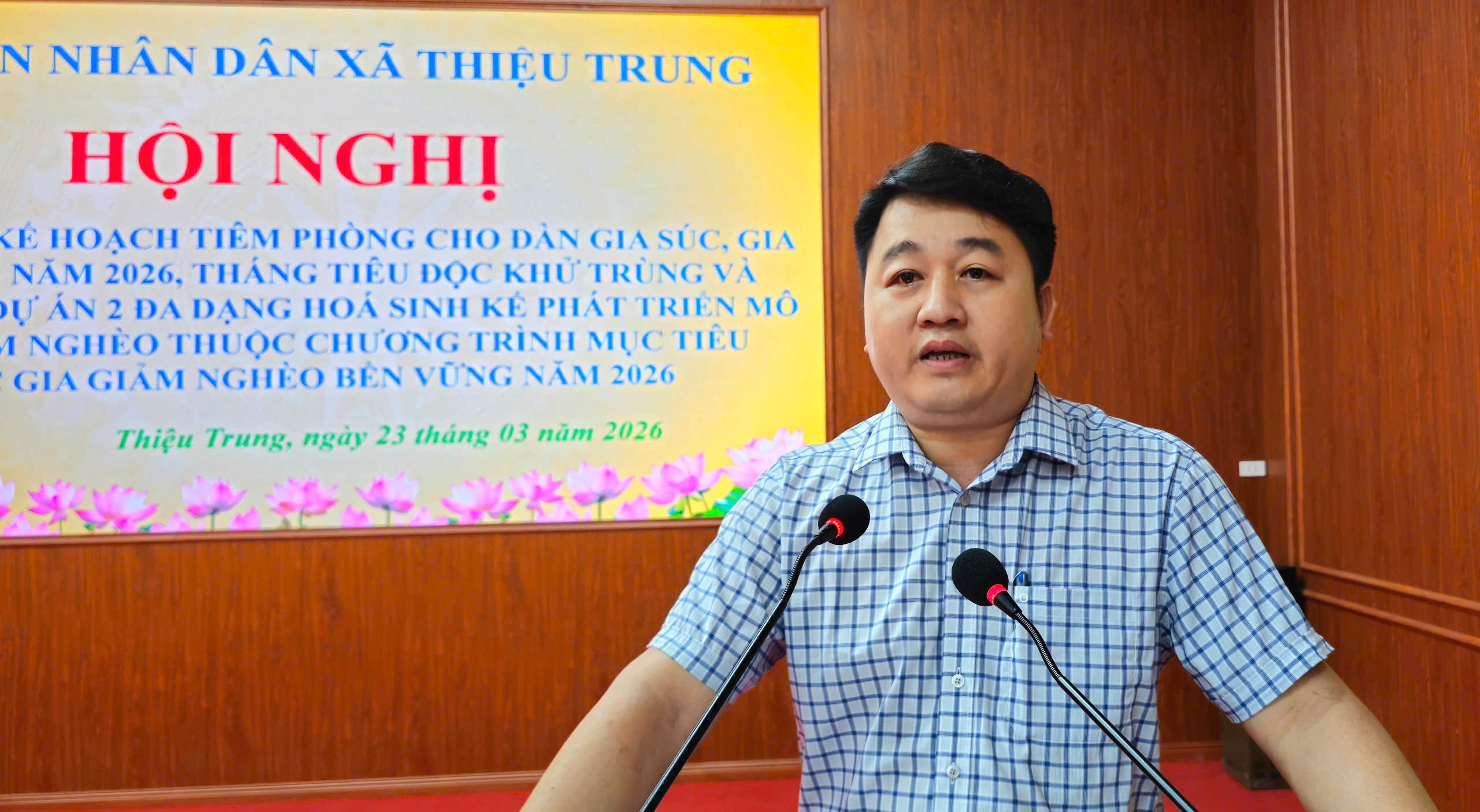 Sáng ngày 23/3/2026, tại Hội trường UBND xã, Ủy ban nhân dân xã Thiệu Trung tổ chức Hội nghị triển khai Kế hoạch tiêm phòng cho đàn gia súc, gia cầm đợt 1; Tháng tổng vệ sinh, tiêu độc, khử trùng môi trường và triển khai Dự án 2 về đa dạng hóa sinh kế, phát triển mô hình giảm nghèo năm 2026. Đồng chí Nguyễn Văn Vũ – Phó Chủ tịch UBND xã chủ trì hội nghị.