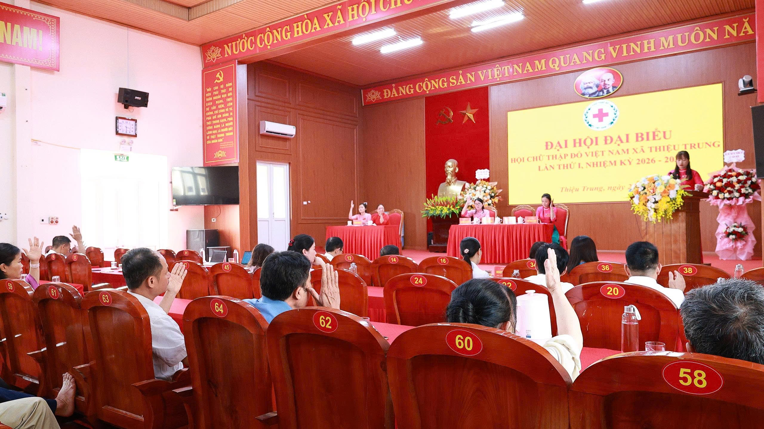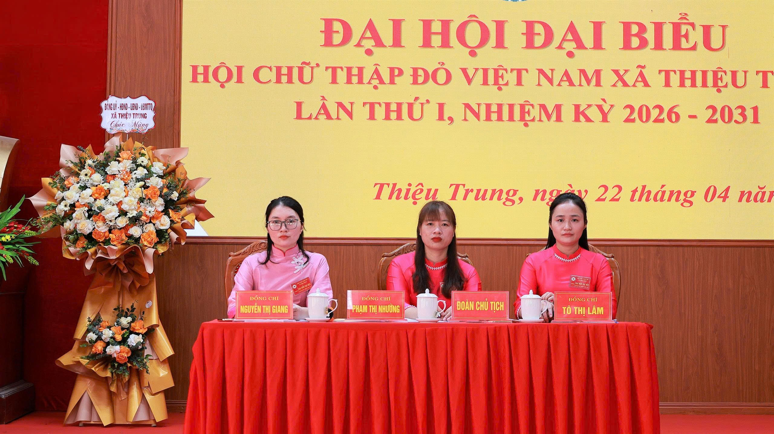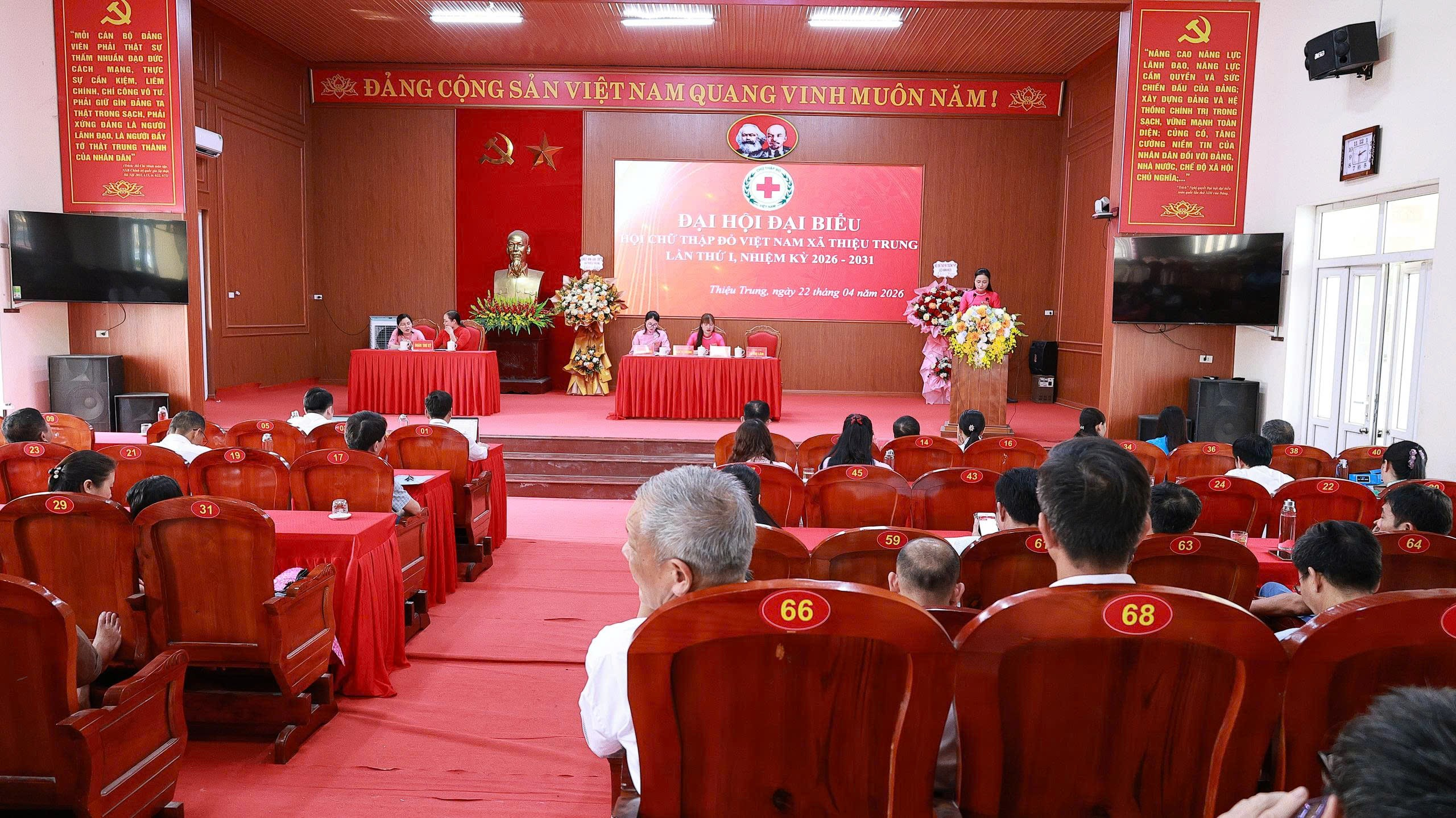 Chiều ngày 22/4/2026, tại Hội trường UBND xã Thiệu Trung, Hội Chữ thập đỏ xã Thiệu Trung đã long trọng tổ chức Đại hội đại biểu lần thứ I, nhiệm kỳ 2026 – 2031. Tham dự đại hội có đồng chí Nguyễn Văn Phúc - Phó bí thư Thường trực Đảng uỷ; đồng chí Nguyễn Thị Tú - Chủ tịch MTTQ xã; đồng chí Trần Ngọc Tùng - Phó chủ tịch UBND xã; các đồng chí lãnh đạo Đảng uỷ, HĐND, UBND; các đồng chí Bí thư, Trưởng thôn, khu phố; cùng đông đảo đại biểu tiêu biểu đại diện cho cán bộ, hội viên, tình nguyện viên Chữ thập đỏ trong toàn xã.